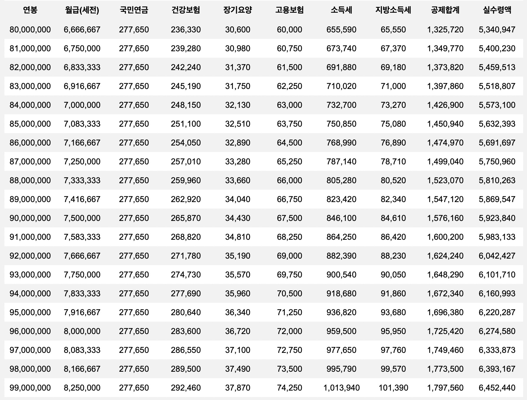 월급 실수령액 표 ( 연봉 8,000 ~ 연봉 9,900 )