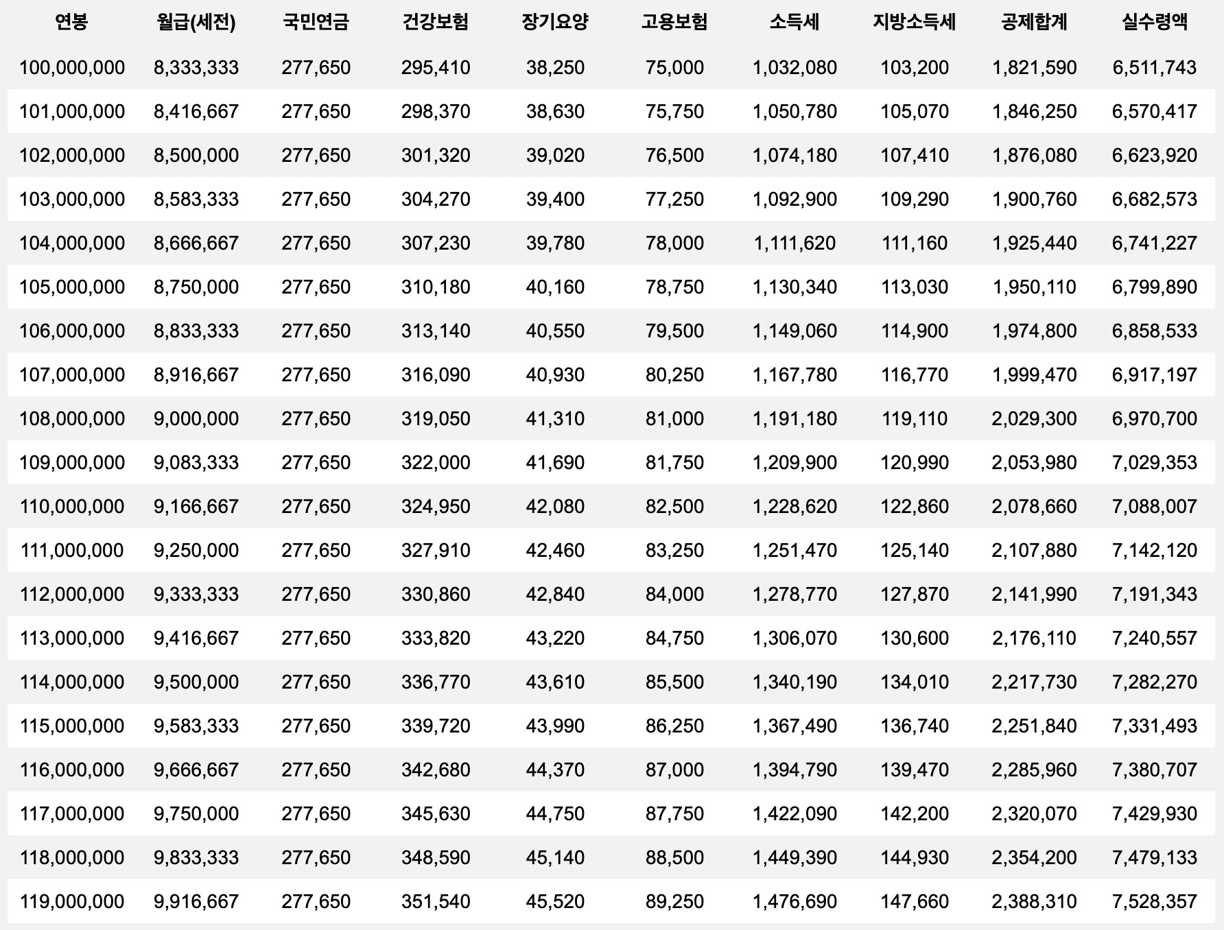 월급 실수령액 표 (연봉 1억 ~ 연봉 1억 1,900)