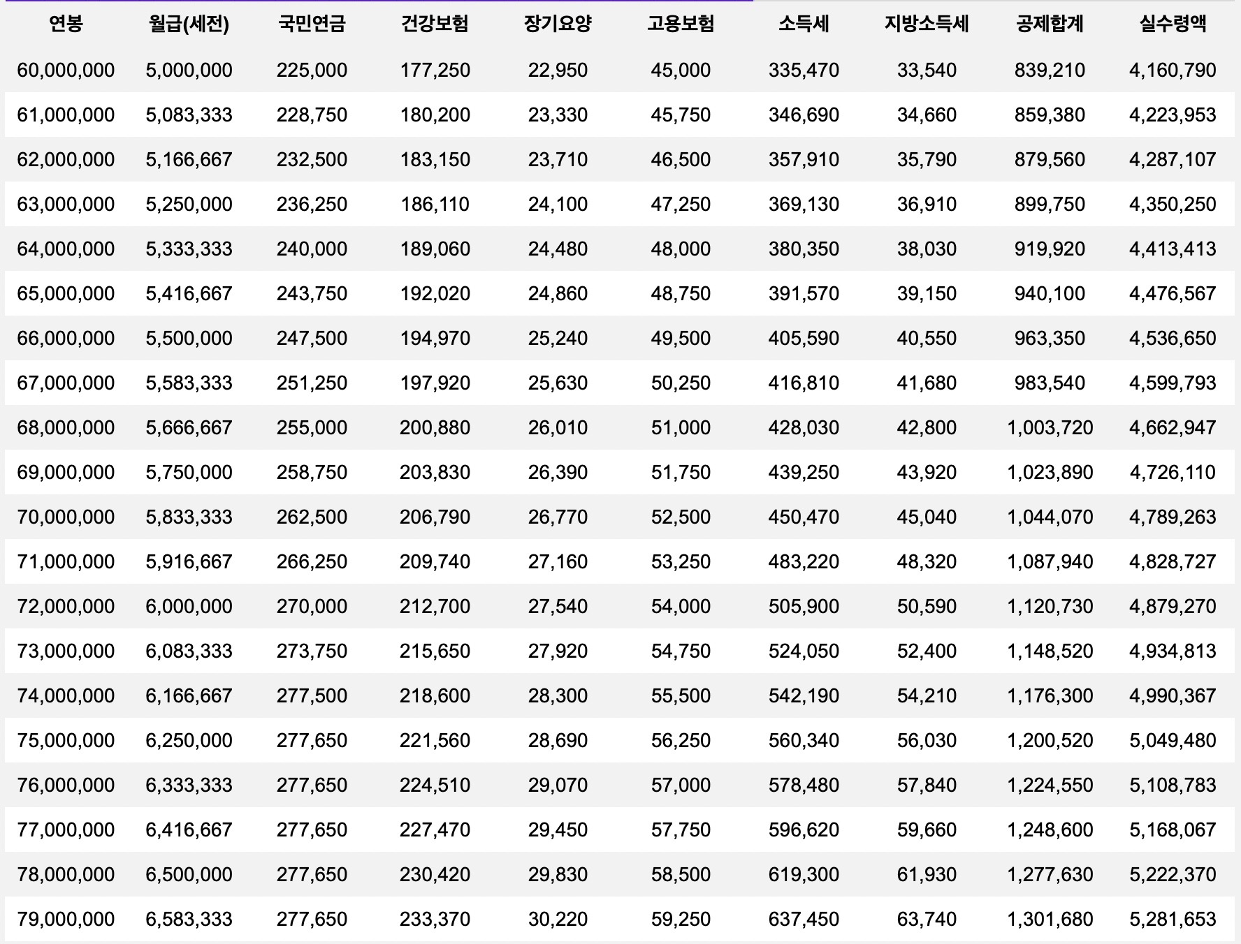 월급 실수령액 표 (연봉 6,000 ~ 연봉 7,900)