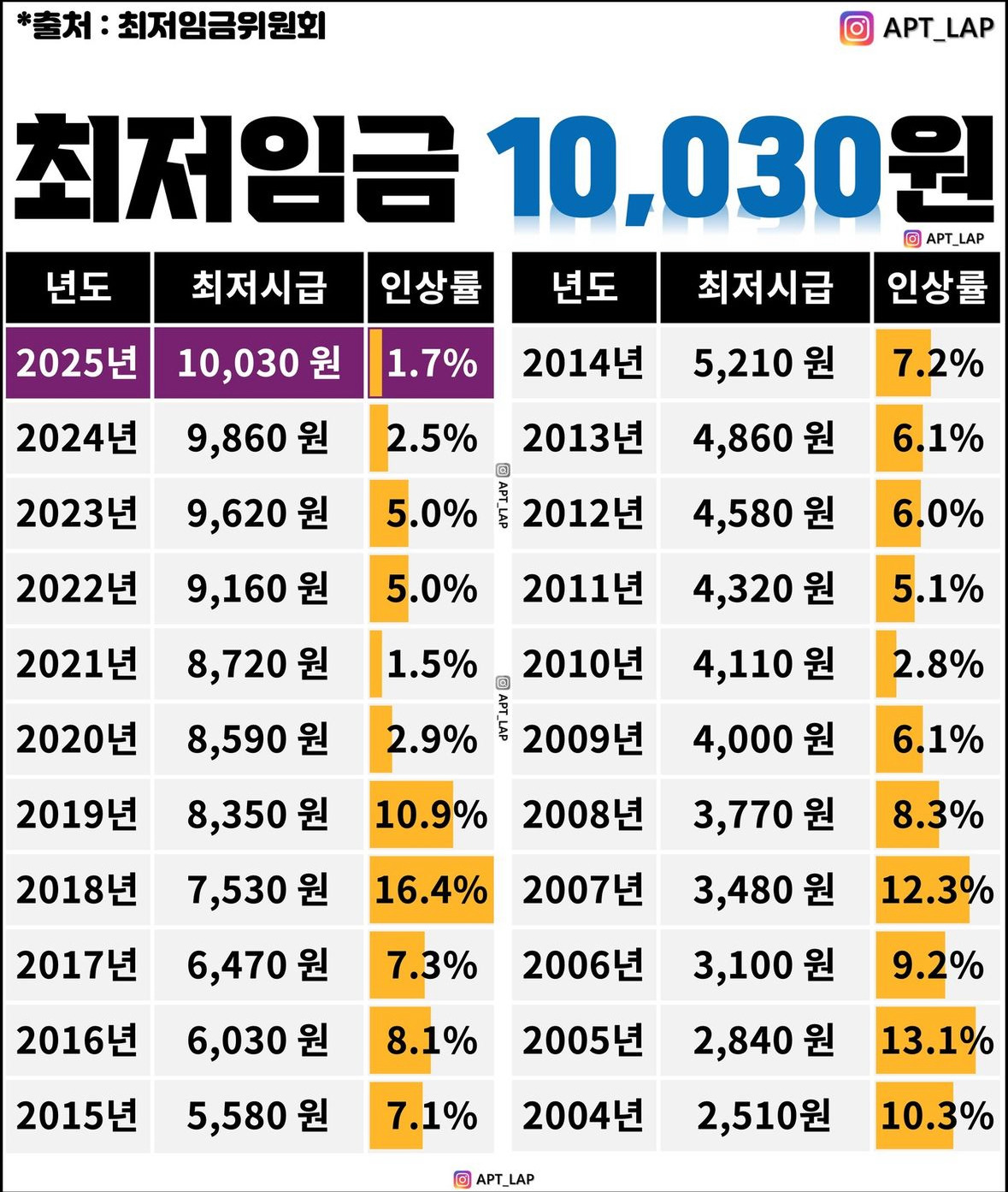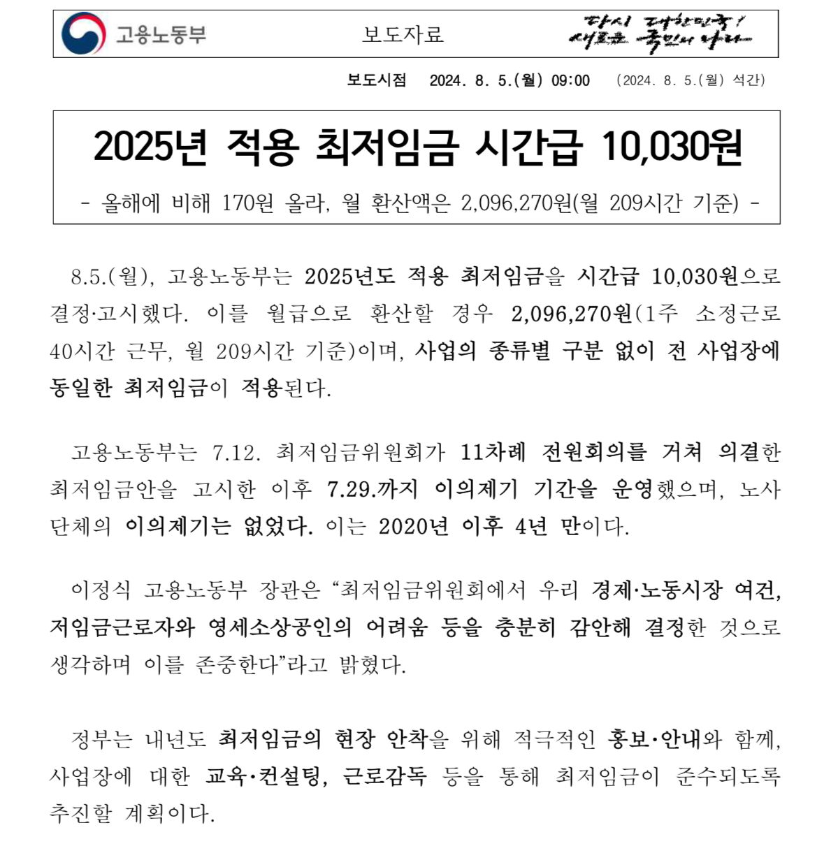 2025년 최저임금이 시간당 10,030원으로 결정되었습니다.