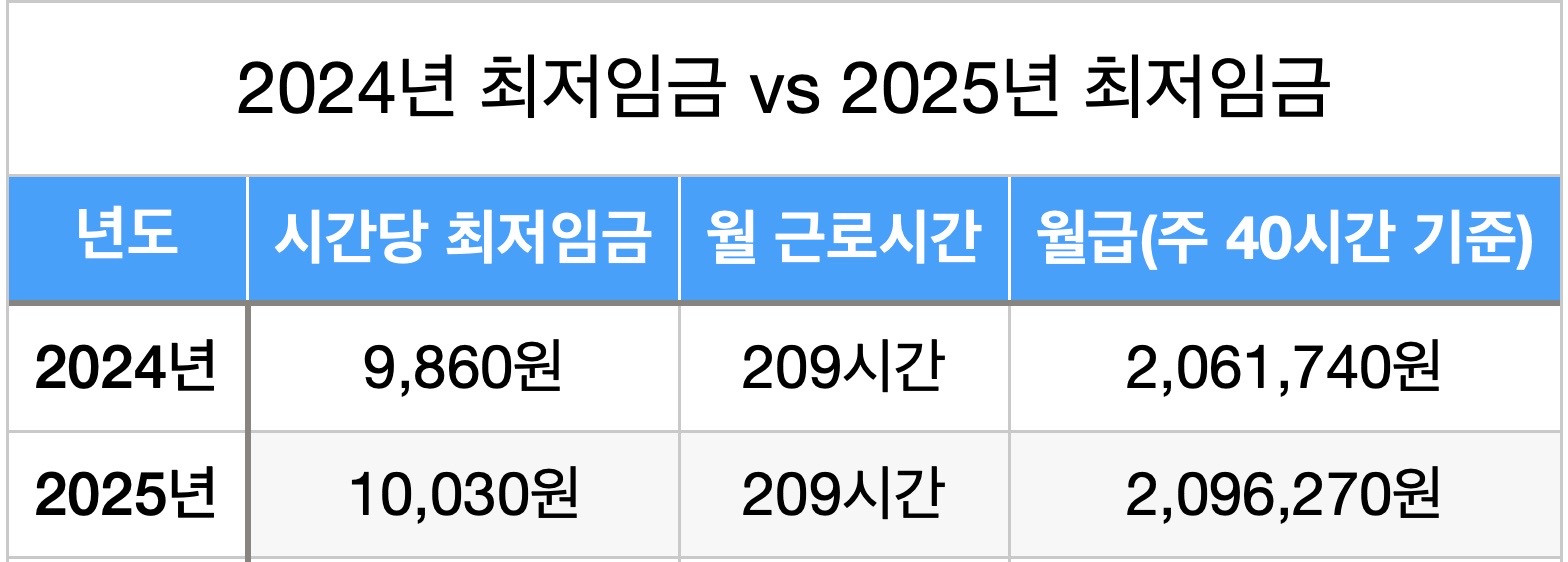 평균 주당 40시간을 일하고, 월 기준으로 209시간을 근무한다고 가정할 때, 월 최저임금은 약 2,096,270원이 되는데